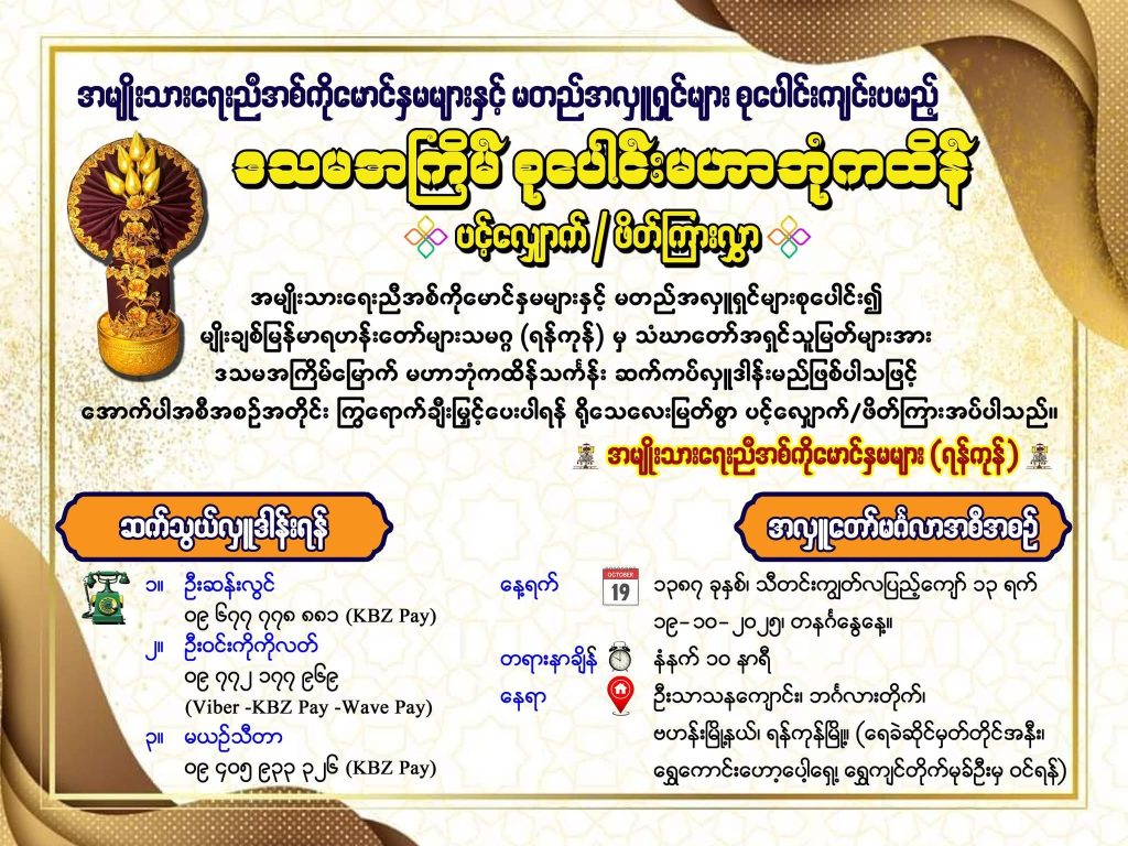 အမျိုးသားရေးညီအစ်ကိုမောင်နှမများနှင့် အလှူရှင်များစုပေါင်း၍ ဒသမအကြိမ်မြောက် စုပေါင်းမဟာဘုံကထိန်အလှူတော်ကို ၁၃၈၇ ခုနှစ်၊ သီတင်းကျွတ်လပြည့်ကျော် ၁၃ ရက်၊ ၁၉-၁၀-၂၀၂၅၊ တနင်္ဂနွေနေ့တွင် ကျင်းပပြုလုပ်မည်ဖြစ်ပါသည်။