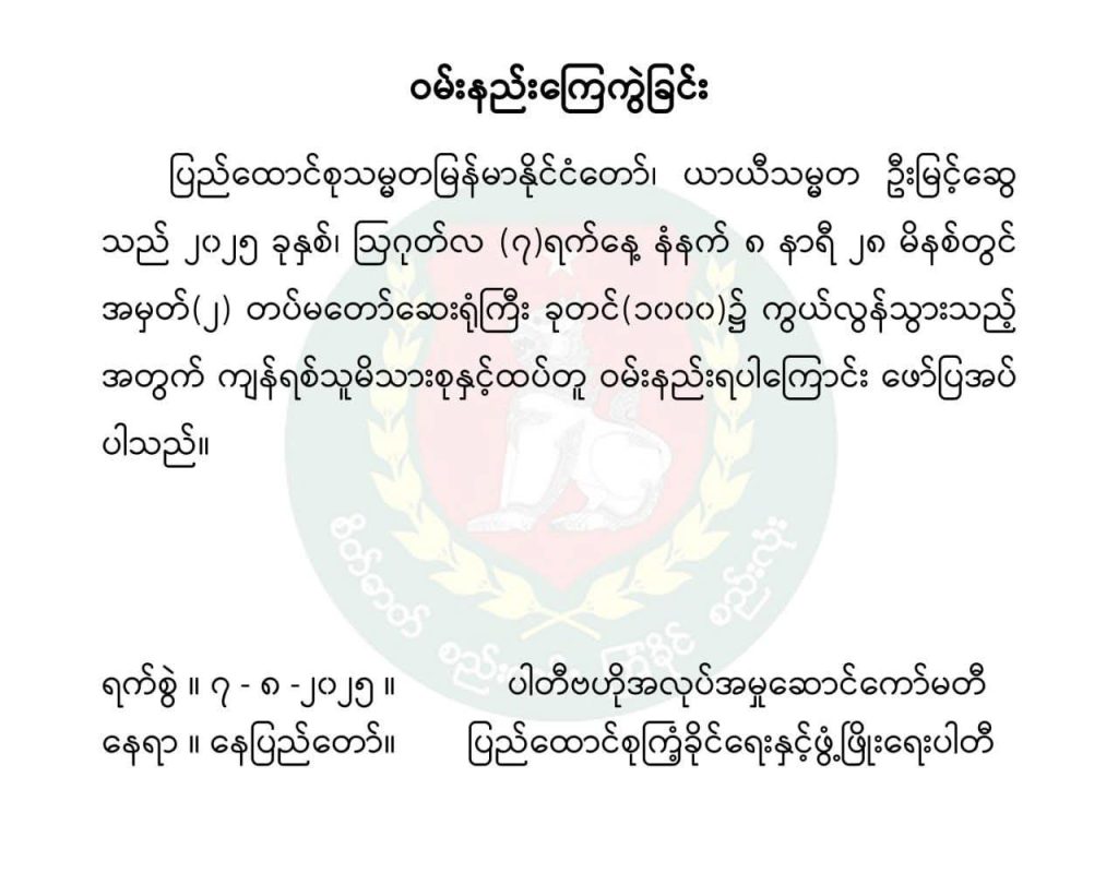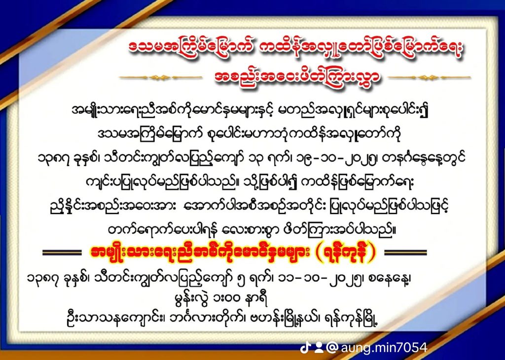 အမျိုးသားရေးညီအစ်ကိုမောင်နှမများနှင့် အလှူရှင်များစုပေါင်း၍ ဒသမအကြိမ်မြောက် စုပေါင်းမဟာဘုံကထိန်အလှူတော်ကို ၁၃၈၇ ခုနှစ်၊ သီတင်းကျွတ်လပြည့်ကျော် ၁၃ ရက်၊ ၁၉-၁၀-၂၀၂၅၊ တနင်္ဂနွေနေ့တွင် ကျင်းပပြုလုပ်မည်ဖြစ်ပါသည်။